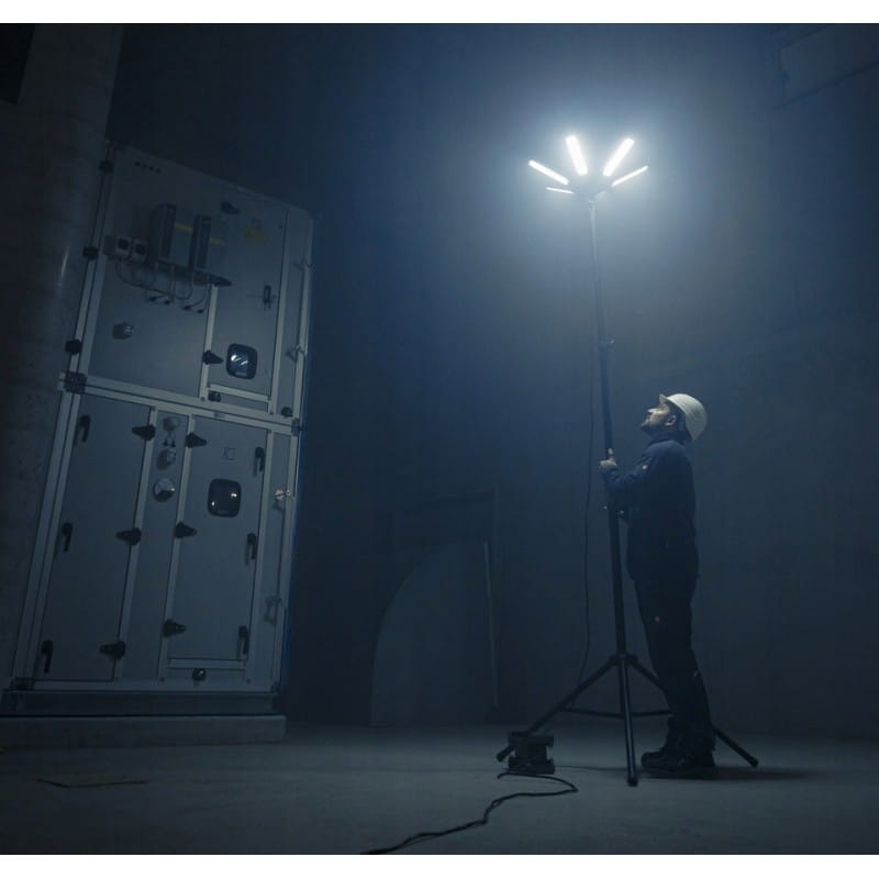 - Niezwykle mocny reflektor budowlany LED 360° o mocy 42000 lm jest idealny do oświetlania placów budowy, zamkniętych przestrzeni lub hal - optymalne oświetlenie środowiska pracy dzięki kątowi wiązki 360°