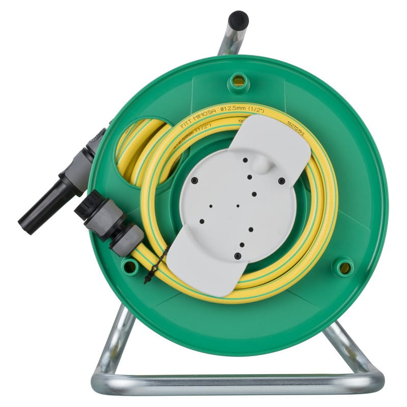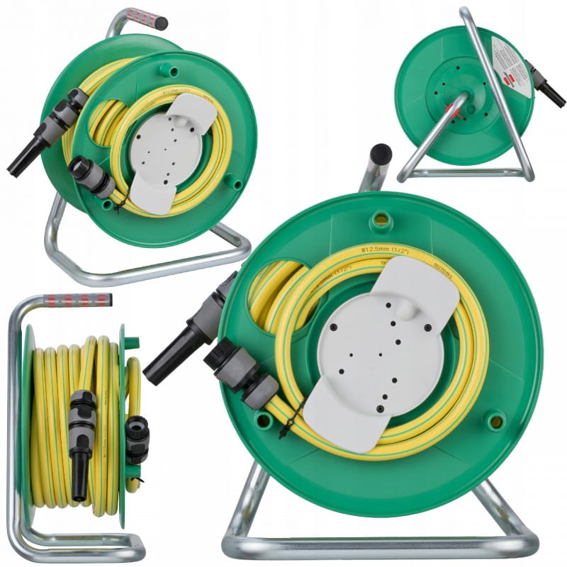 Bęben wyposażony jest w stabilną podstawę oraz korbę, która umożliwia szybkie i łatwe zwijanie węża po zakończonej pracy. Składany uchwyt ułatwia transport i przechowywanie.