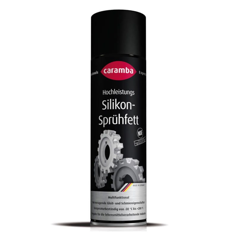 6074001 Smar silikonowy w spray'u CARAMBA jest wielofunkcyjnym środkiem smarującym i pielęgnacyjnym do wszechstronnych zastosowań w przypadku łożysk walcowych, zawiasów, szyn ślizgowych, rolek kierunkowych z metalu i tworzywa, połączeń elektrycznych, przełączników itp. Zalety Smar silikonowy w spray'u CARAMBA jest bezbarwnym, odpornym na ściekanie, niemal bezzapachowym smarem o dużym udziale silikonu. Dzięki wysokiej stabilności jest idealnie przystosowany do smarowania powierzchni pionowych. Warstwa smarująca jest odporna na temperatury w zakresie od -30 °C do +200 °C. Smar silikonowy CARAMBA nie starzeje się i jest odporny na utlenianie. Działa wypierająco na wodę, zabezpiecza przed korozją. Wielofunkcyjny smar silikonowy CARAMBA został zarejestrowany z NSF jako smar kategorii H1 (nr rej. 142186). W związku z tym przypadkowy kontakt z żywnością jest dozwolony. Sposób użycia Wyczyścić podłoże. Wstrząsnąć puszką tak aby było słychać kulkę mieszającą i nałożyć poprzez natryskiwanie cienką warstwę na suche podłoże. Dokładnie przewietrzyć. Pojemność: SPRAY 500ml