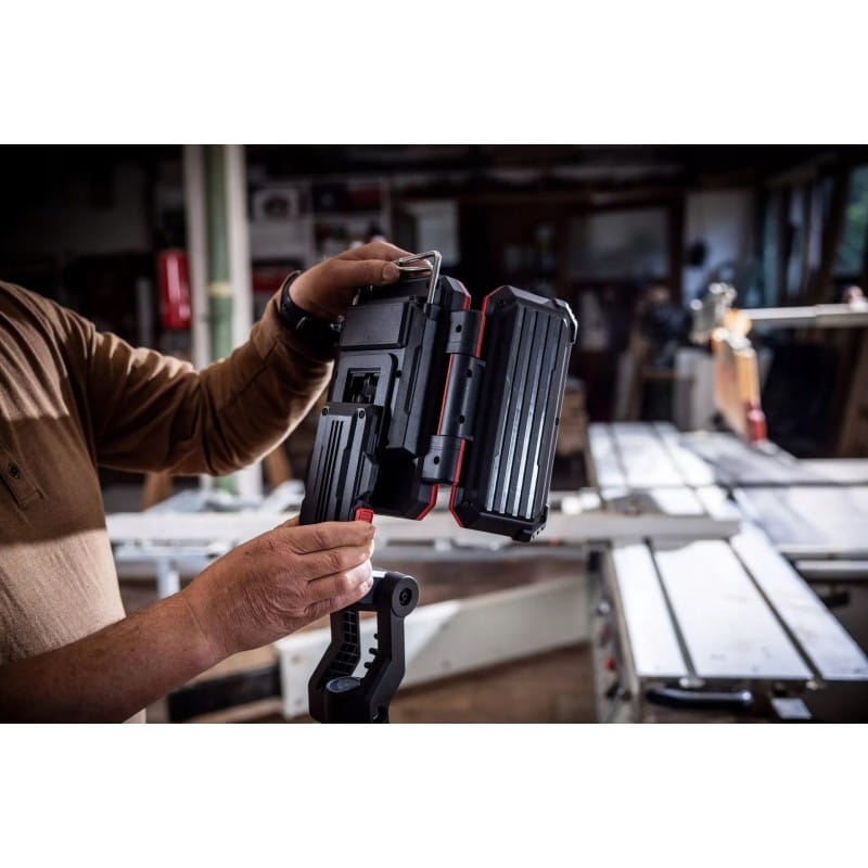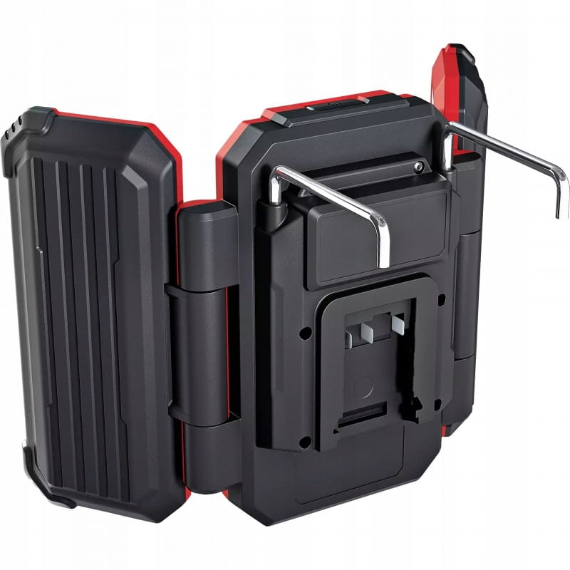 - Wszechstronna głowica lampy może działać bezpośrednio z akumulatorem 18V jako lampa robocza, z możliwością montażu na haku lub statywie.