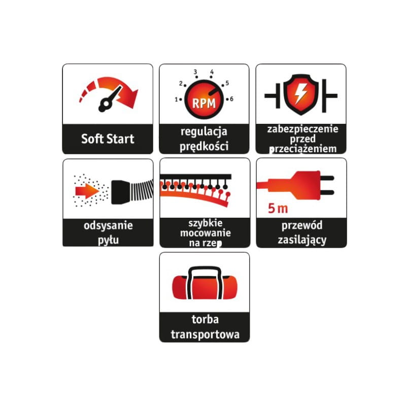 - Szlifierki do gładzi używaj wyłącznie do szlifowania powierzchni ścian i sufitów zgodnie z przeznaczeniem. Zawsze stosuj okulary ochronne, maskę przeciwpyłową i ochronę słuchu. Pracuj na stabilnym podłożu i trzymaj narzędzie pewnym chwytem. Przed wymianą papieru ściernego lub czyszczeniem odłącz urządzenie od zasilania. Nie używaj uszkodzonego sprzętu ani pracuj w pobliżu wilgoci. Przechowuj w suchym miejscu, z dala od dzieci.