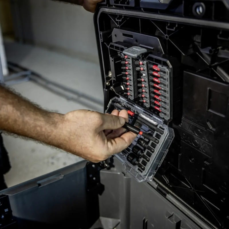 - Pudełka wyposażone są w trwałe, metalowe zatrzaski, a dodatkowe uchwyty zapewniają elastyczną i wygodną obsługę. Blokujące szybkozłącza umożliwiają szybkie, elastyczne i łatwe łączenie poszczególnych pudełek, co pozwala na dostosowanie systemu przechowywania do indywidualnych potrzeb.