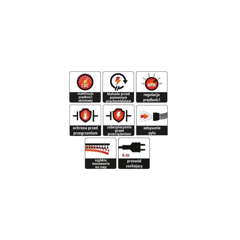 - Elekronika: ze stabilizacja predkosci obrotowej, łagodnym rozruchem, zabezpieczeniem przeciazeniowym i ustawieniem wstepnym predkosci obrotowej za pomoca pokretła