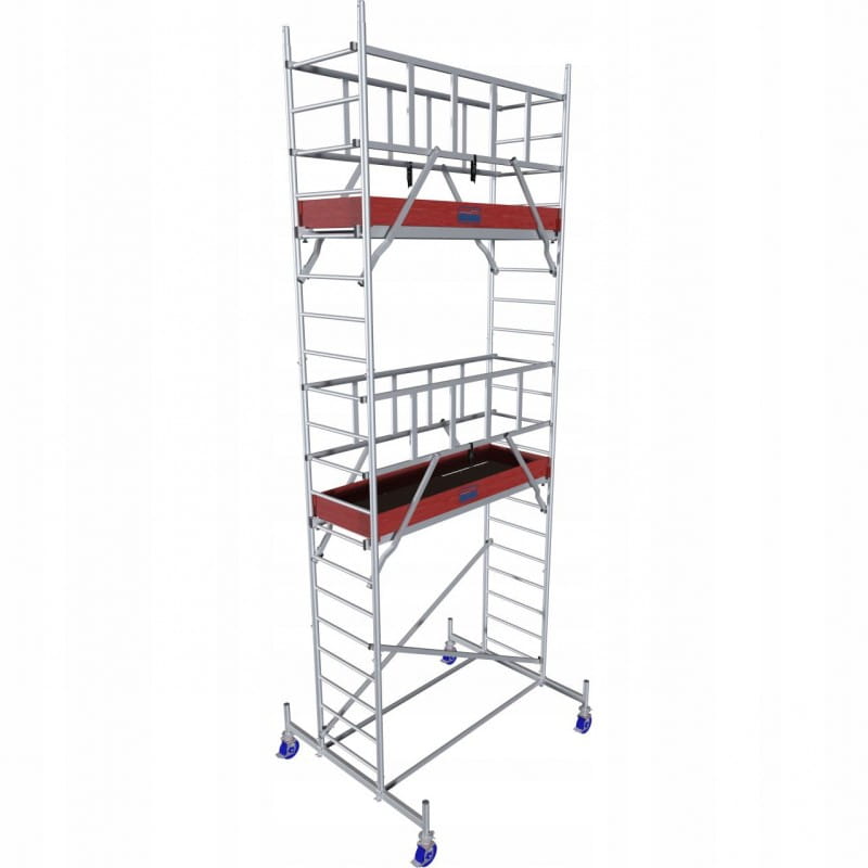 Dodatkowo rolki jezdne wyposażone są w hamulce oraz możliwość regulacji wysokości, co pozwala na stabilne ustawienie rusztowania nawet na nierównym podłożu.