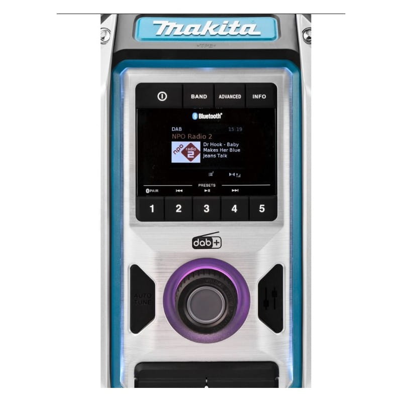 Wysoko wydajne radio z funkcją Bluetooth z klasyfikacją izolacji obudowy IP65. Zasilane akumulatorami: CXT 10,8V; 14,4V i LXT 18V oraz sieciowo. Funkcja Bluetooth umożliwia połączenie z odtwarzaczem muzyki. Wyposażony w łącze AUX i USB do ładowania telefonu.