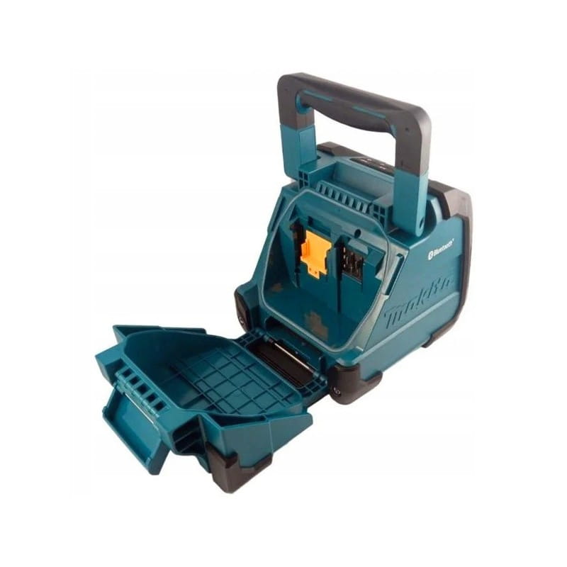 Głośnik Makita DMR200 to wytrzymałe, mobilne urządzenie audio przeznaczone do pracy na budowie, w warsztacie oraz w plenerze. Obsługuje zasilanie z akumulatorów CXT 10,8–12V, LXT 14,4V, LXT 18V oraz z dołączonego zasilacza sieciowego. Dzięki technologii Bluetooth umożliwia bezprzewodowe odtwarzanie muzyki do 10 metrów, a dodatkowy port AUX-IN pozwala podłączyć inne urządzenia przewodowo.