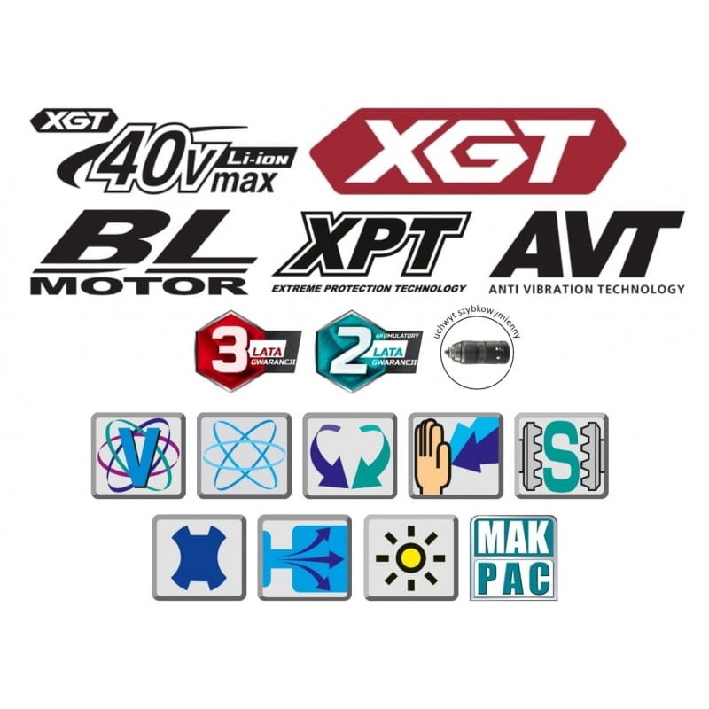 - Typ akumulatorów: Li-ion (XGT / LXT - z opcjonalnym adapterem ADP10 - brak w zestawie)