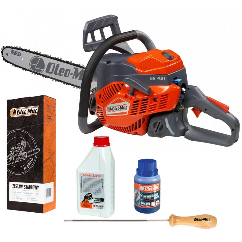 W zestawie: pilarka Oleo-Mac GS 451, standardowe wyposażenie fabryczne oraz zestaw startowy GRATIS.