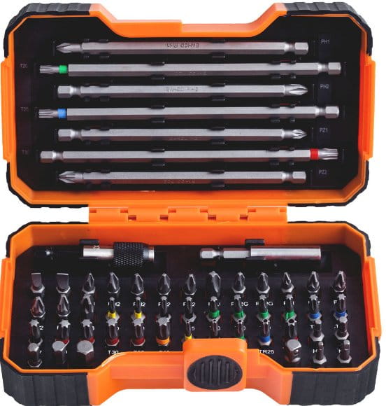 Bity wykonano z wysokostopowej stali S2 i wykończono poprzez piaskowanie, co przekłada się na trwałość oraz odporność na zużycie podczas intensywnej eksploatacji. Całość umieszczona jest w solidnej kasecie z tworzywa, ułatwiającej organizację, transport i szybki dostęp do elementów.