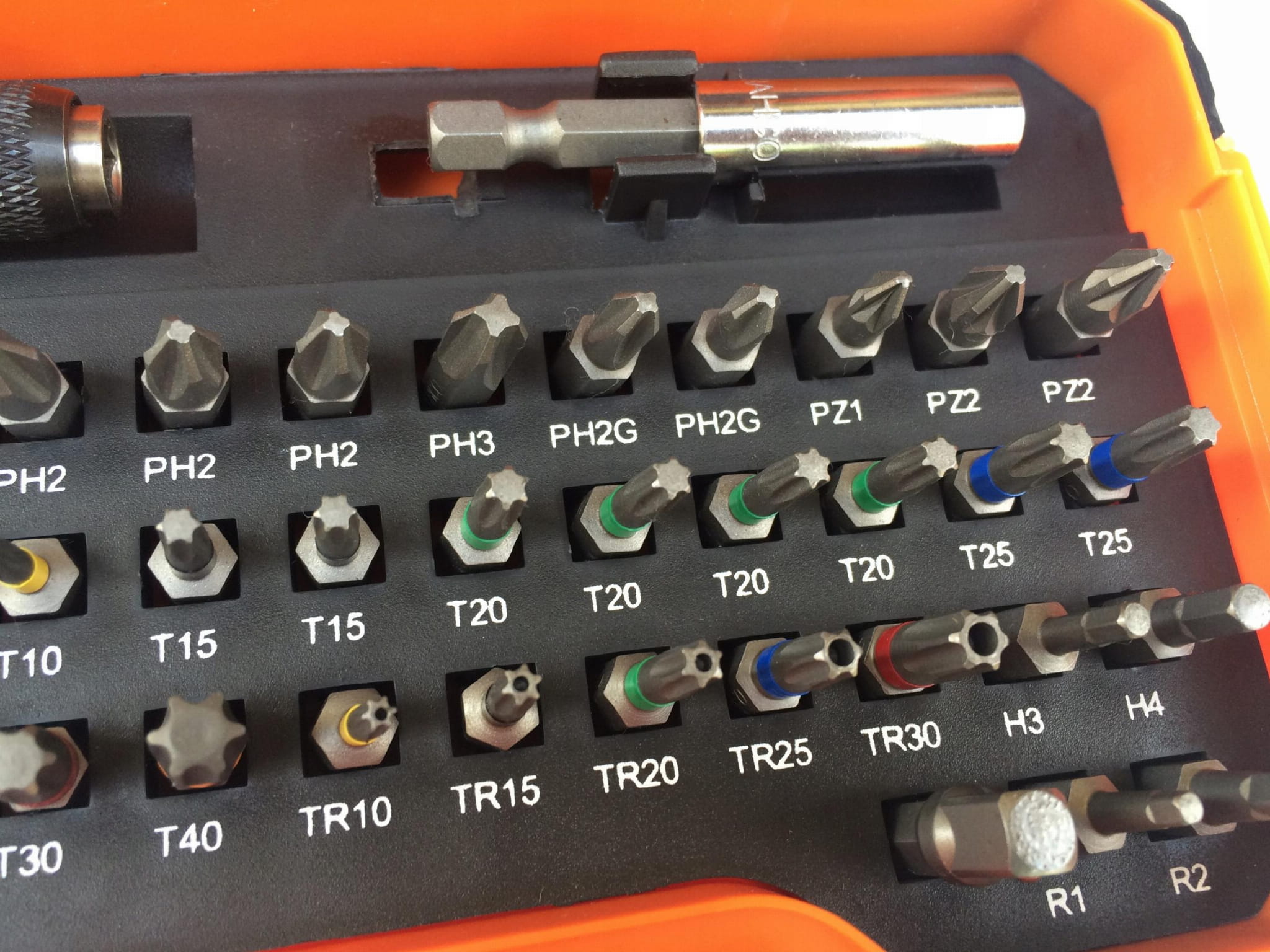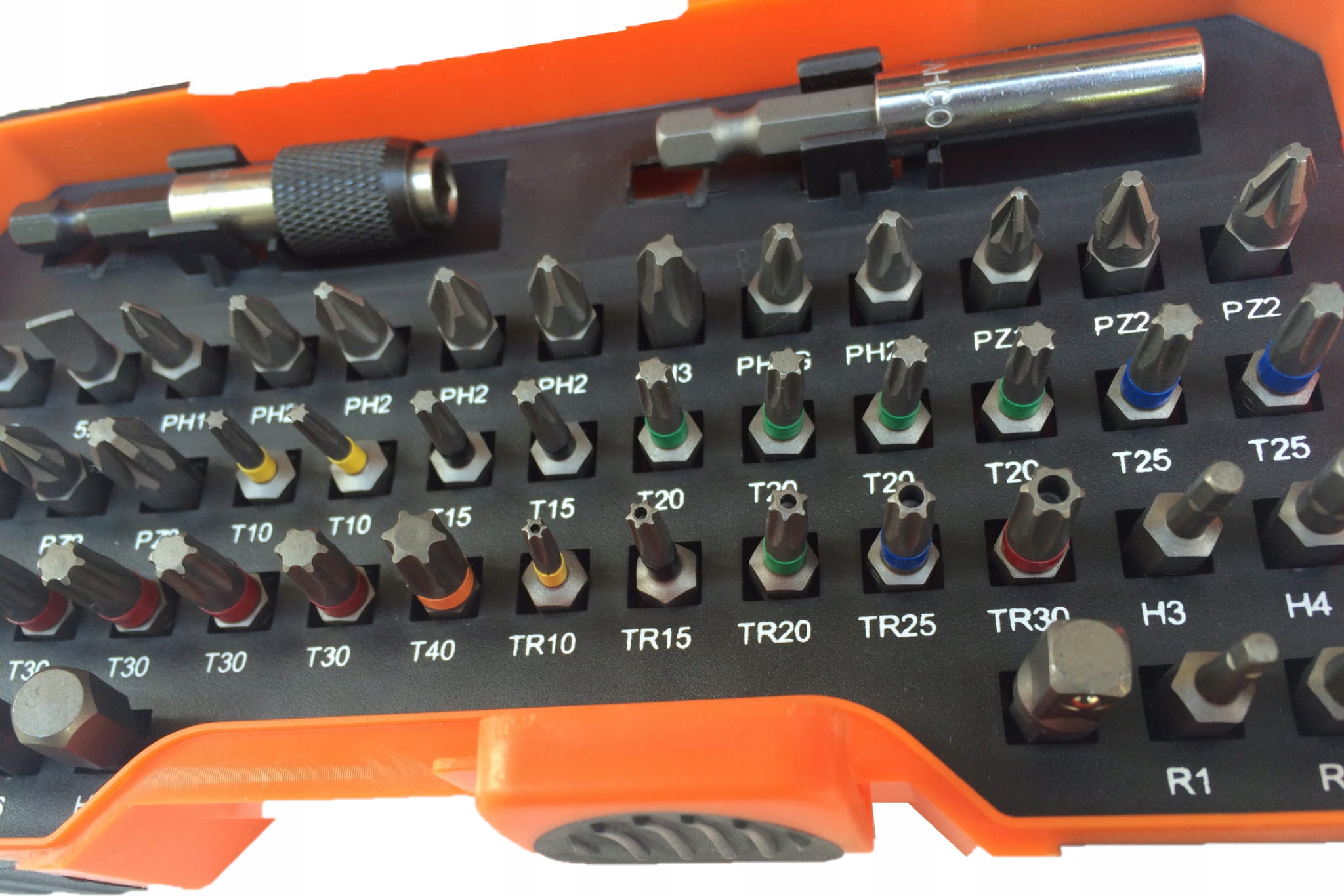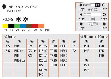 - Końcówki 1/4" 25 mm Torx: T10 – 2 szt.; T15 – 2 szt.; T20 – 4 szt.; T25 – 2 szt.; T27 – 1 szt.; T30 – 4 szt.; T40 – 1 szt.