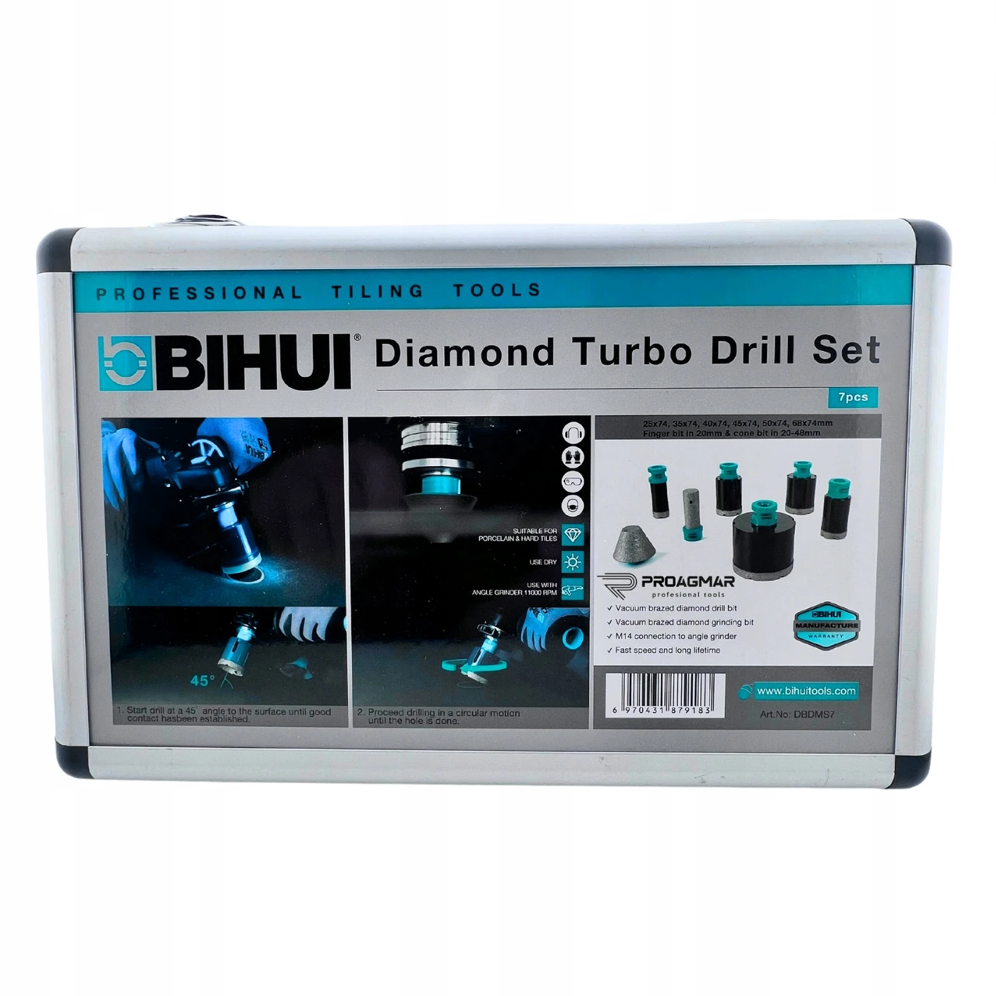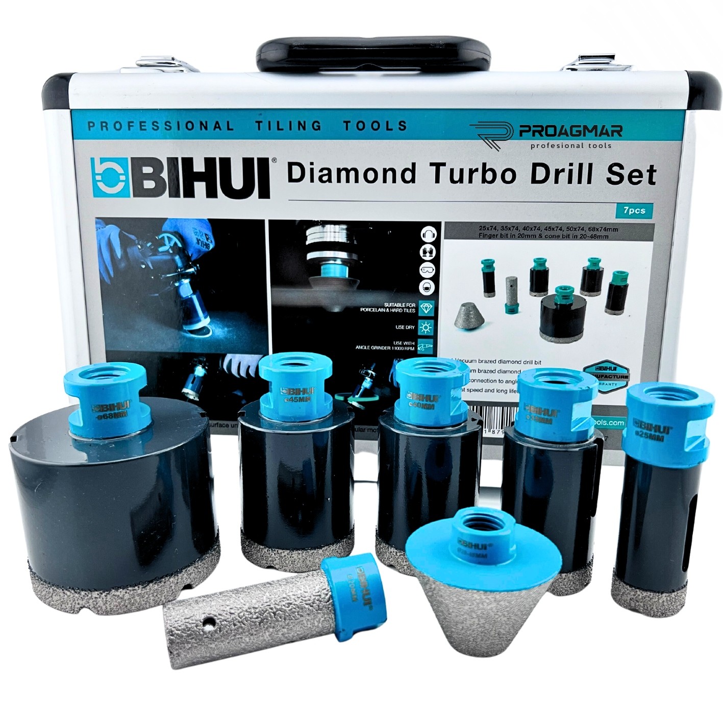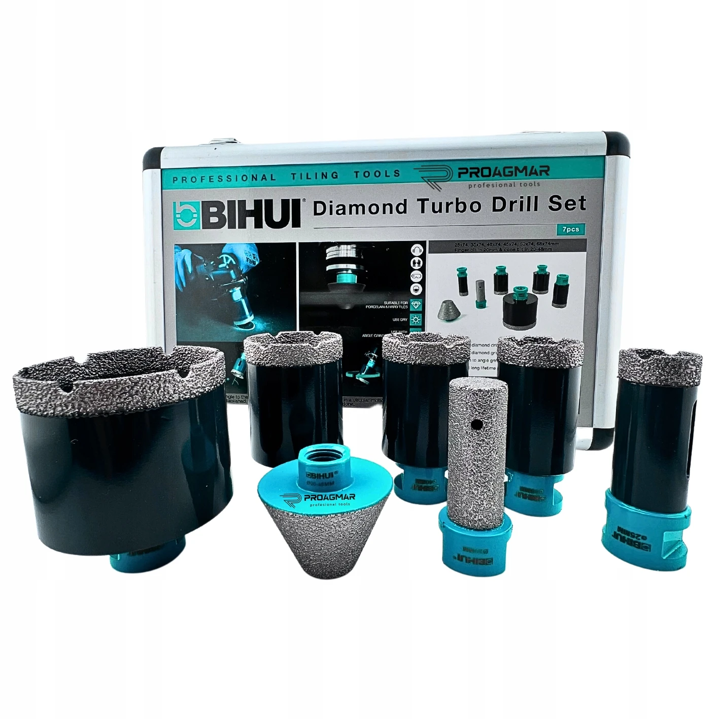 BIHUI DBDMS7 to profesjonalny zestaw otwornic diamentowych M14 (7 elementów) do wiercenia i obróbki otworów w gresie, ceramice i kamieniu.