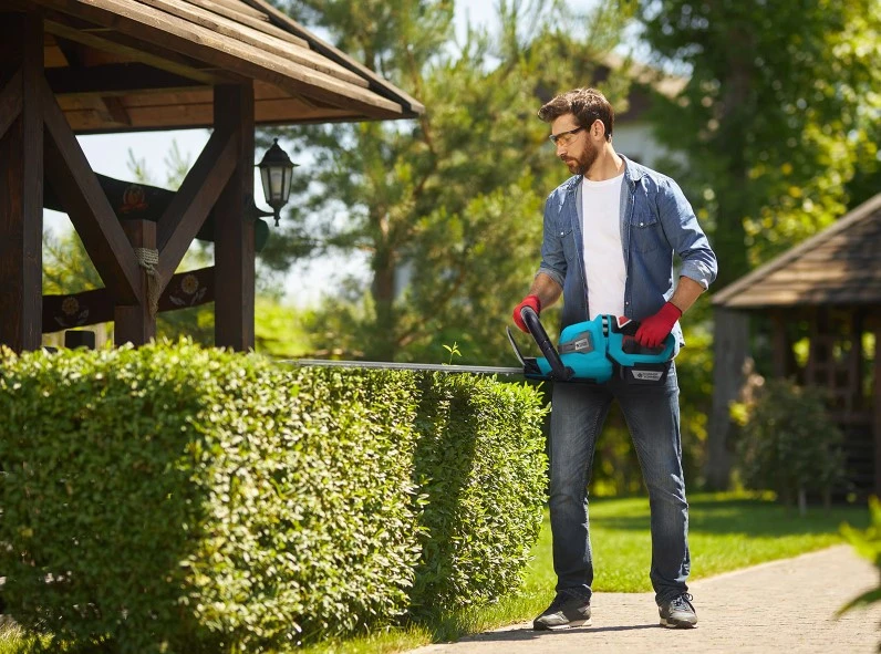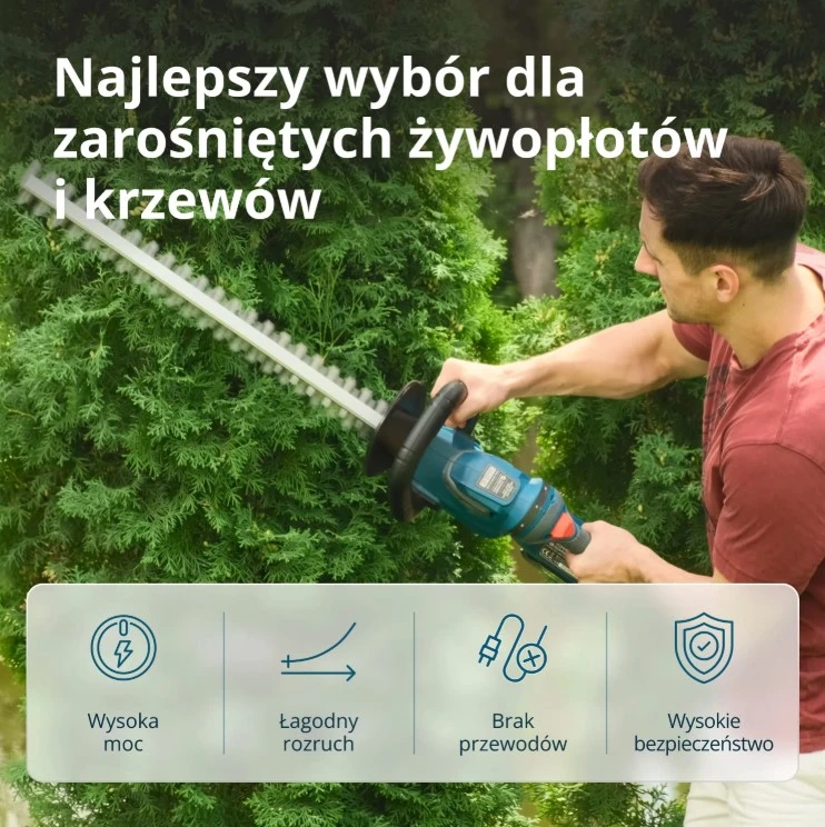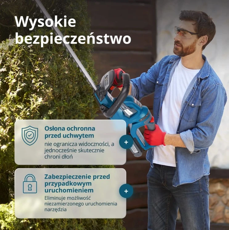 - Nożyce do żywopłotu akumulatorowe – informacje o bezpieczeństwie (GPSR) Nożyce stosuj wyłącznie do przycinania żywopłotu i krzewów. Trzymaj ręce z dala od listwy tnącej i używaj ochrony oczu oraz rękawic. Przed czyszczeniem lub usuwaniem zakleszczonych gałęzi odłącz akumulator. Nie używaj w deszczu ani w pobliżu przewodów elektrycznych. Przechowuj narzędzie z osłoną listwy w suchym miejscu.