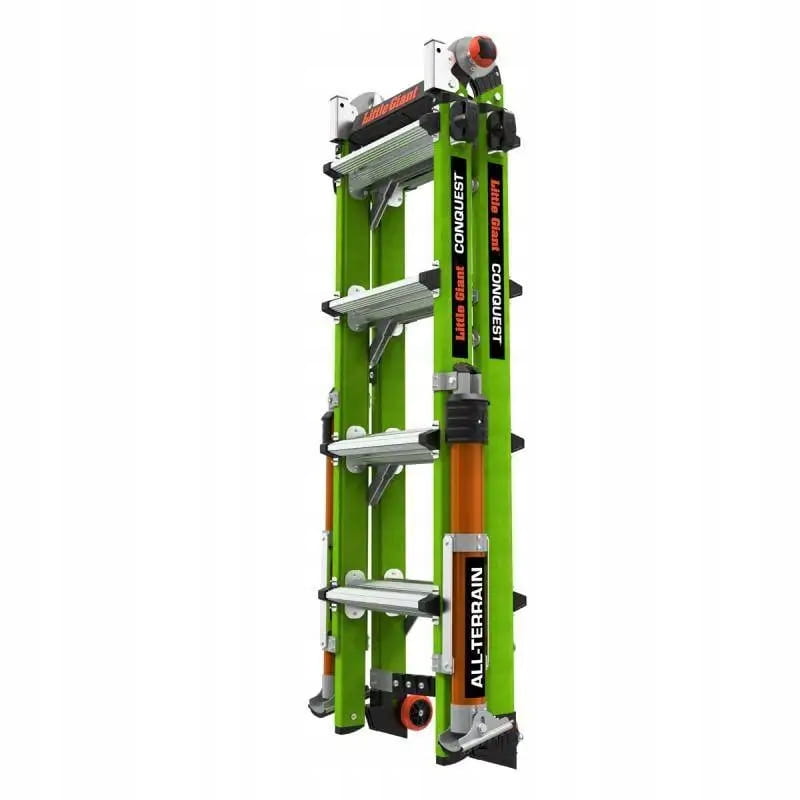 Little Giant Conquest 2.0 4×4 to profesjonalna drabina teleskopowa z włókna szklanego, zapewniająca pełną izolację elektryczną i wyjątkową stabilność. Umożliwia pracę w kilku konfiguracjach: przystawnej, pochyłej, schodowej oraz 90°.