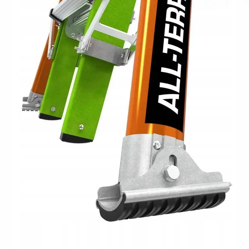 Wsporniki o regulowanej wysokości kompensują nierówności podłoża, a obrotowa podstawa z kolcami zwiększa przyczepność. Dzięki włóknu szklanemu model jest idealny do pracy przy instalacjach elektrycznych.
