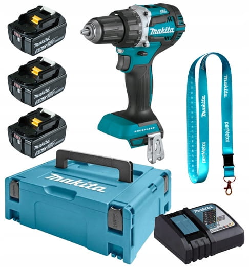 Zestaw zawiera: wiertarko-wkrętarkę, 3x akumulator 18V 5,0Ah, szybką ładowarkę DC18RC oraz walizkę systemową Makpac 2 z wkładem.