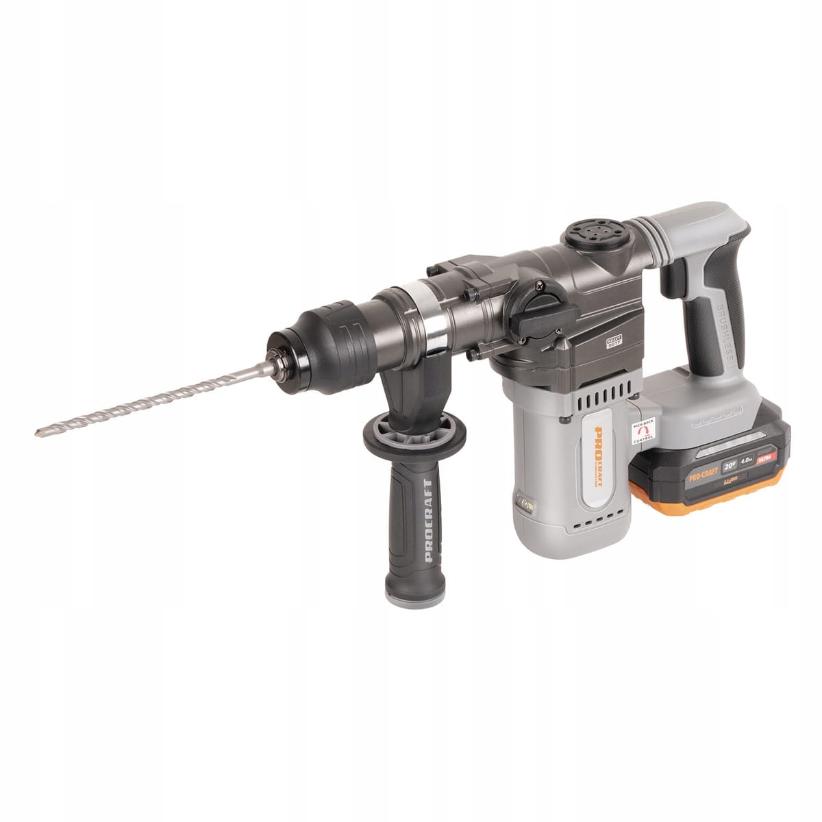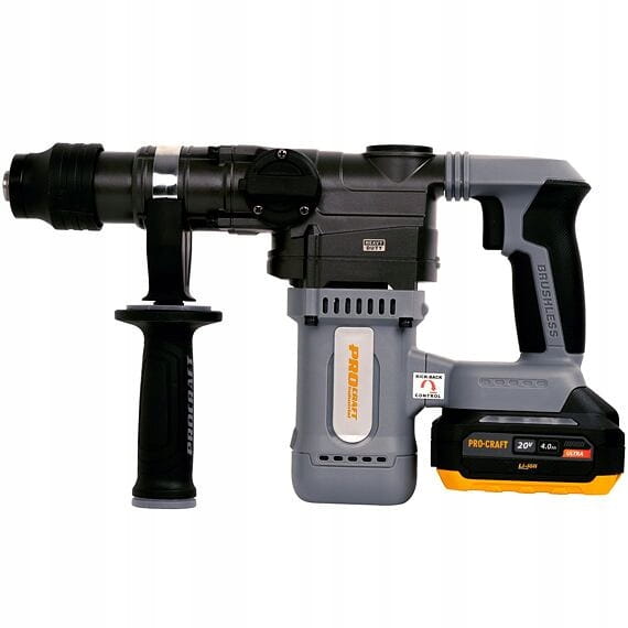 Procraft Industrial HD20A to akumulatorowy młot udarowo-obrotowy 20V z energią udaru 3,8 J, przeznaczony do wiercenia i kucia w betonie, murze i stali. Bezszczotkowy silnik zapewnia wysoką moc i długą żywotność, a system Kickback Control zwiększa bezpieczeństwo pracy. Uchwyt SDS Plus umożliwia szybką wymianę osprzętu, a ergonomiczna konstrukcja gwarantuje komfort.