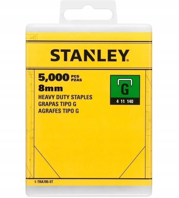 Stanley 1-TRA705-5T Zestaw zszywek G 4/11/140 (5000 szt.) to stalowe zszywki galwanizowane o podwyższonej wytrzymałości, przeznaczone do prac montażowych i wykończeniowych. Sprawdzają się przy mocowaniu izolacji, wykładzin, tektury oraz pokryć dachowych.