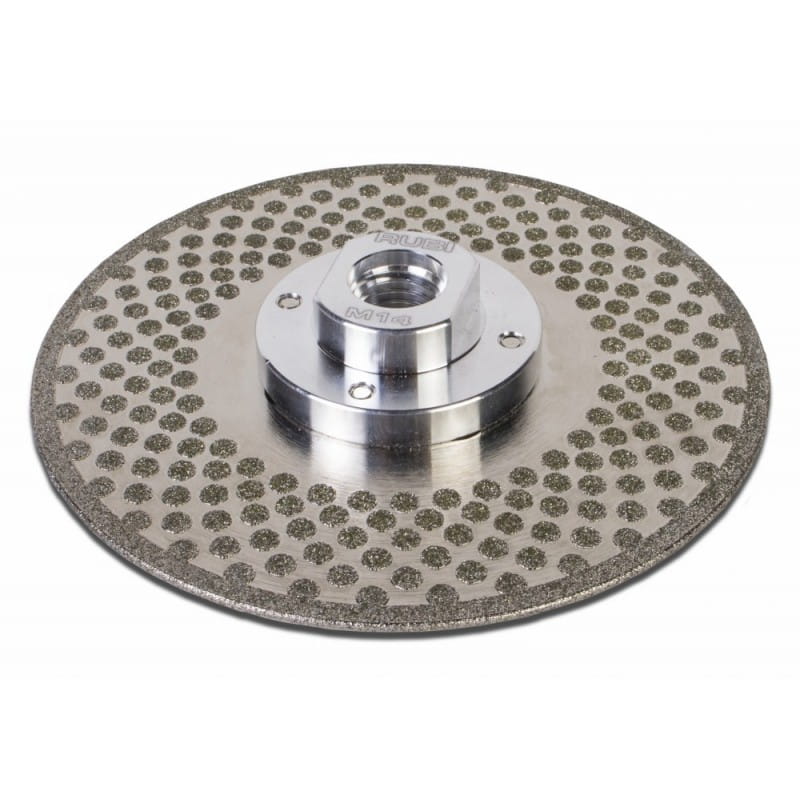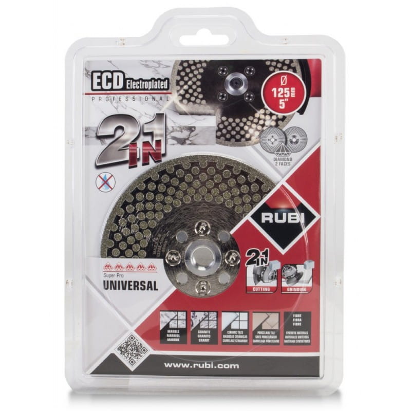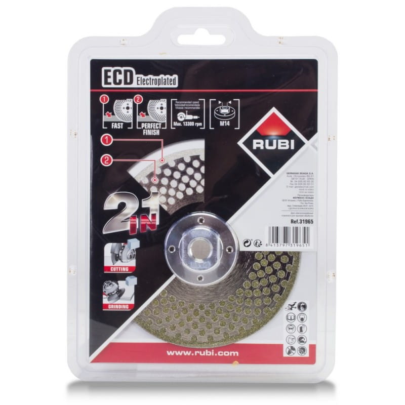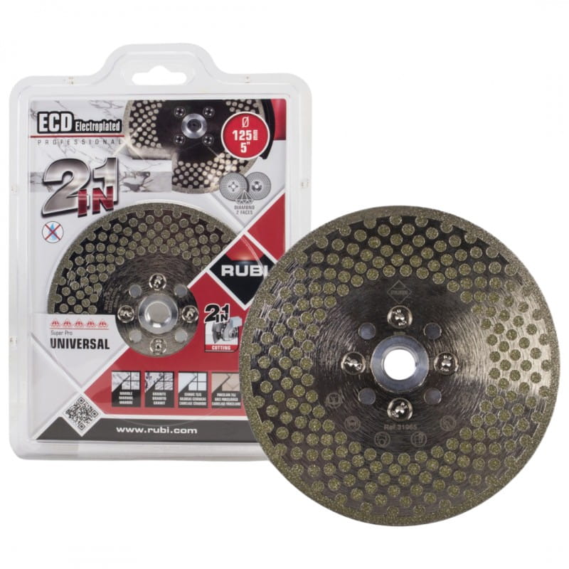 RUBI jest znane z wielu wszechstronnych produktów. Tarcza ECD 2w1 przeznaczona do cięcia i szlifowania jednocześnie doskonale się w tę ofertę wpisuje. Tarcze ECD są przeznaczone do cięcia i szlifowania płytek kamiennych, ceramicznych oraz materiałów syntetycznych. Diament jest nanoszony metodą powlekania elektrolitycznego, co pozwala na uzyskanie wyskokiej jakości cięcia tak jak przy użyciu tarczy z obrzeżem ciągłym oraz szybkości i wysokiej jakości szlifowania.