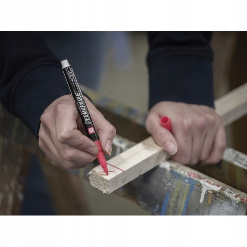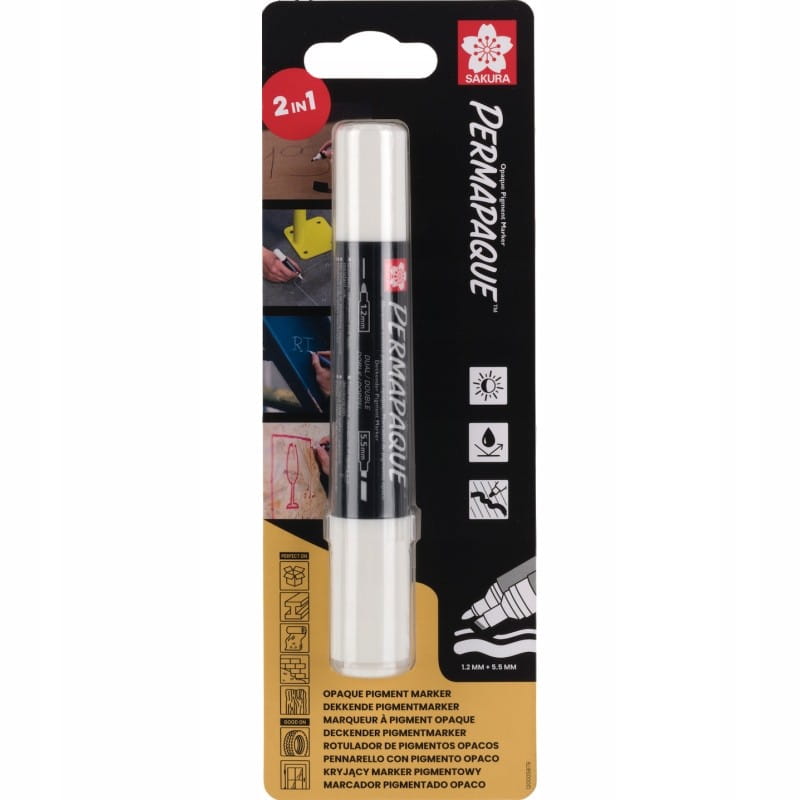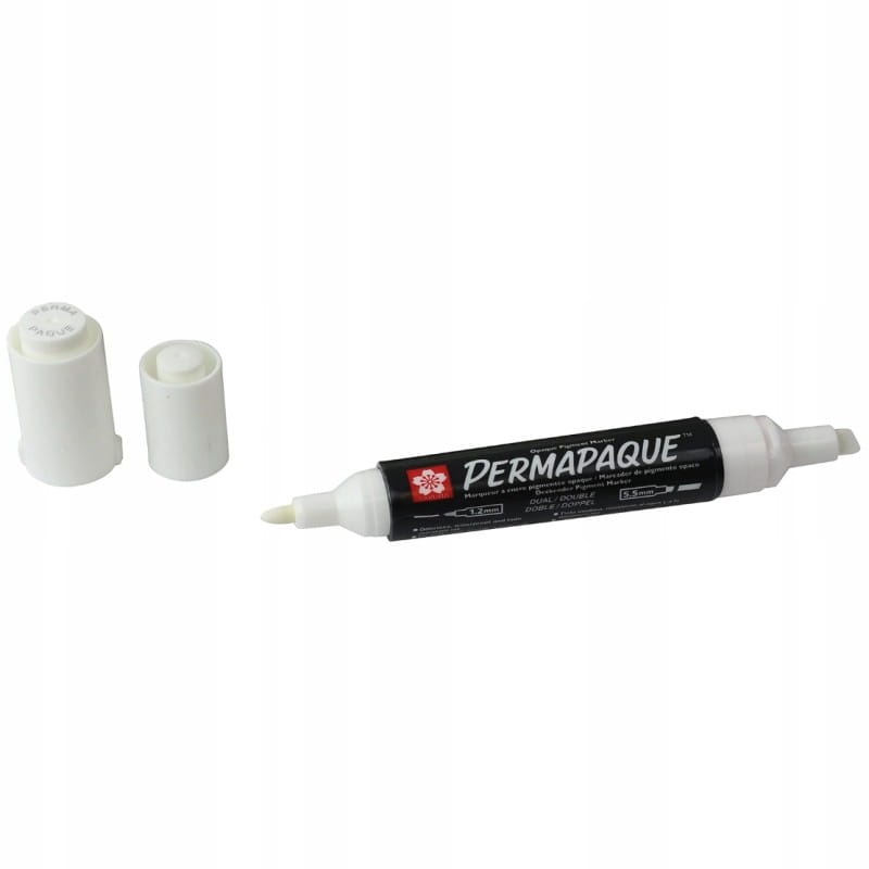 - Sakura Permapaque to wyjątkowy, uniwersalny marker permanentny z atramentem pigmentowym na bazie wody. Marker ma dwie końcówki: cienką 1,2 mm i szeroką 5,5 mm, i nie wymaga wstrząsania ani pompowania przed użyciem.